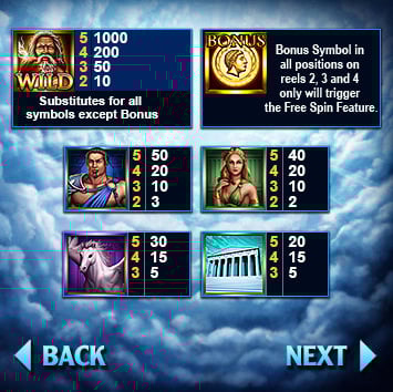 General Rules: Mighty Zeus pays left to right on adjacent reels, as per the paytable, and pays only the highest win on a payline. All wins occur on selected lines only, except Scatter wins, which pays out anywhere on separate reels.